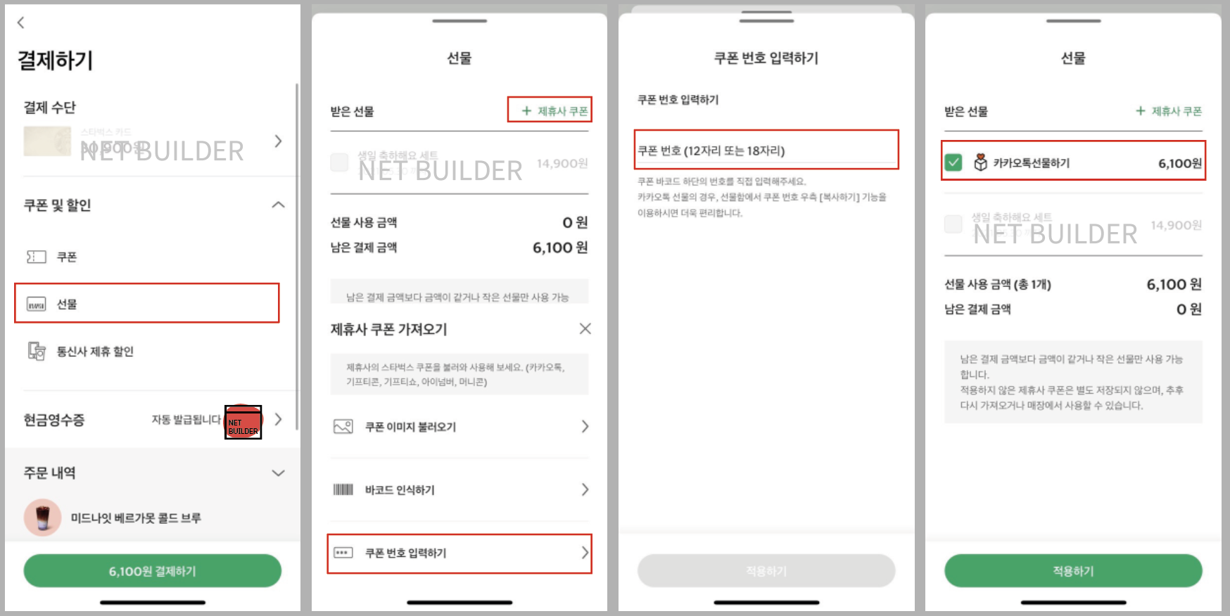 4. 쿠폰 입력 후, 해당 선물로 결제한다.